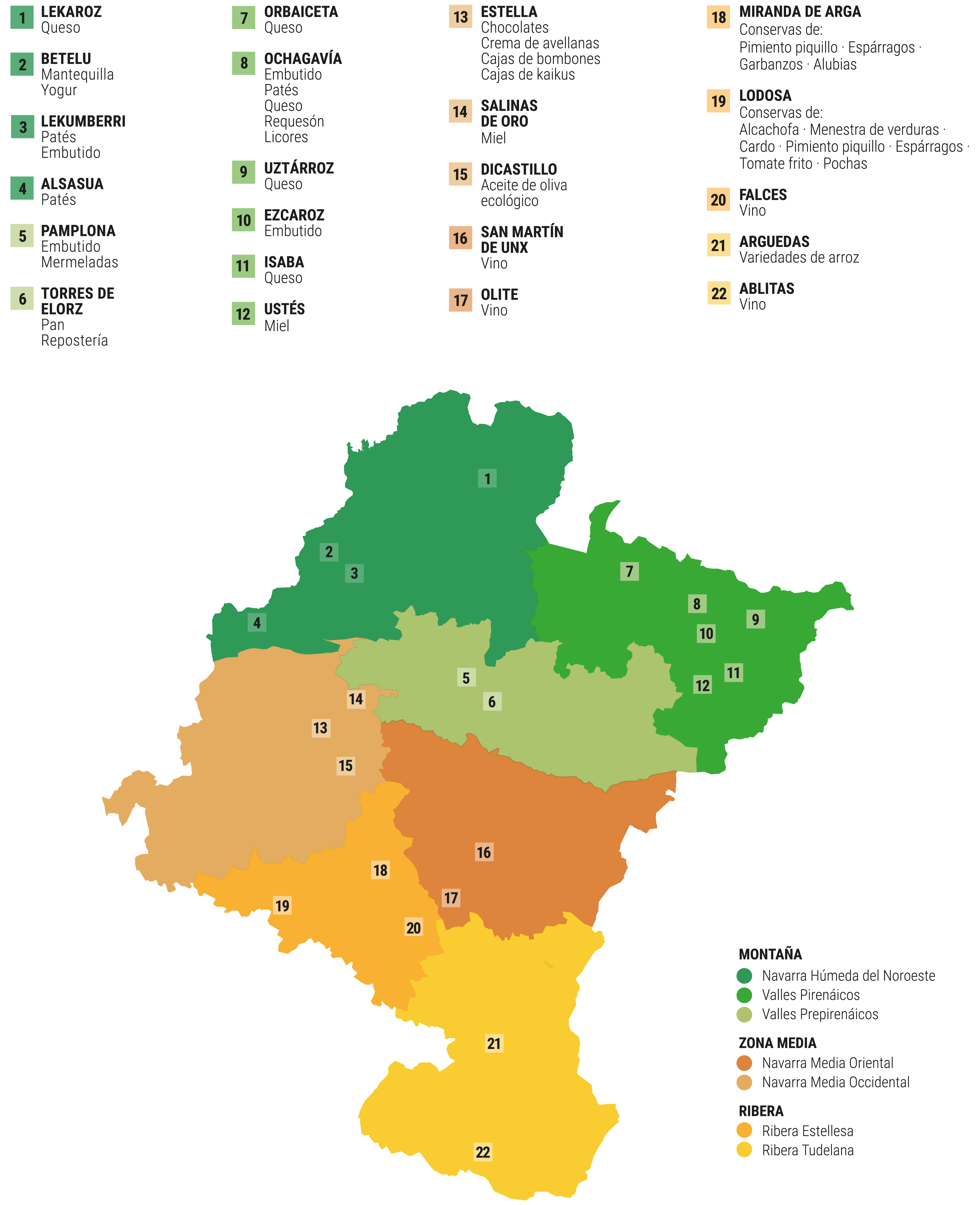 Arroz, conservas de legumbres, de espárragos, alcachofas, cardo, menestra, pochas, pimientos del piquillo, tomate frito, embutidos variados, queso, paté, mantequilla, mermeladas, vino, sidra, licores…